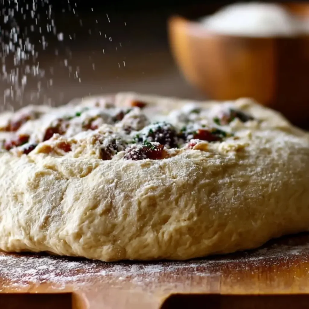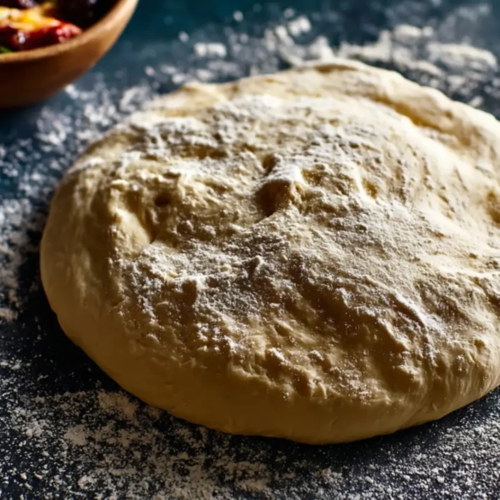 A close-up shot of homemade sun dried tomato pizza dough proofing on a floured wooden surface before being baked.