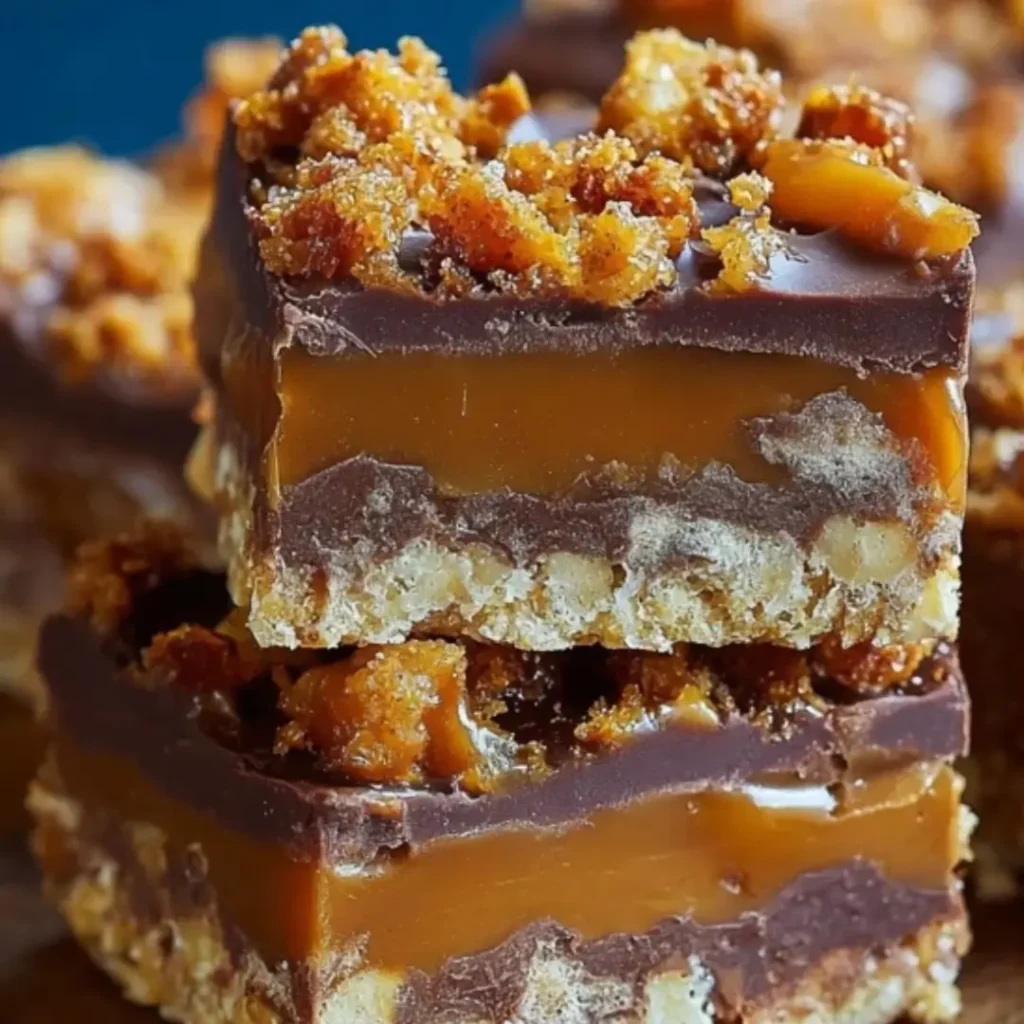 A close-up stack of homemade Chocolate Caramel Crunch Bars, with layers of crust, gooey caramel, and a chocolate topping.