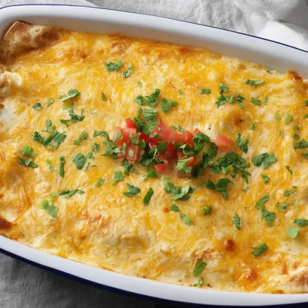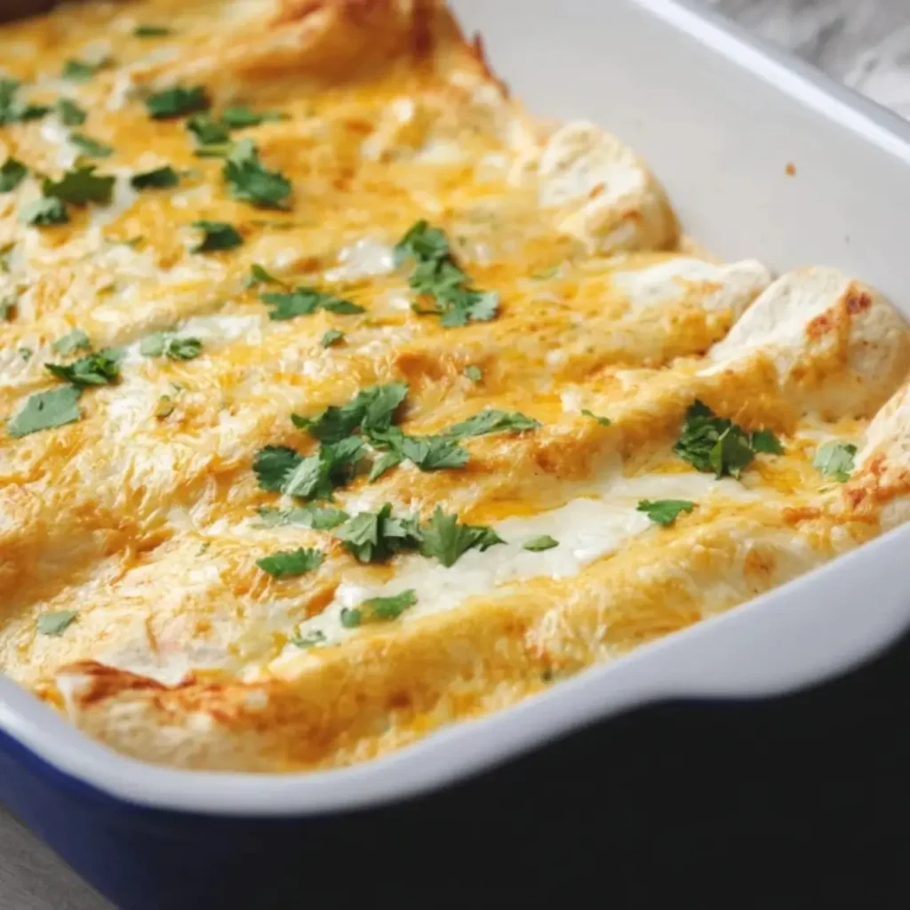 A close-up of creamy chicken enchiladas in a white baking dish, topped with melted cheese and garnished with fresh cilantro.