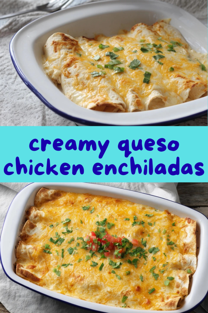 Comforting chicken enchiladas filled with seasoned shredded chicken, creamy queso sauce, and plenty of melted cheese, baked until bubbly and golden.
