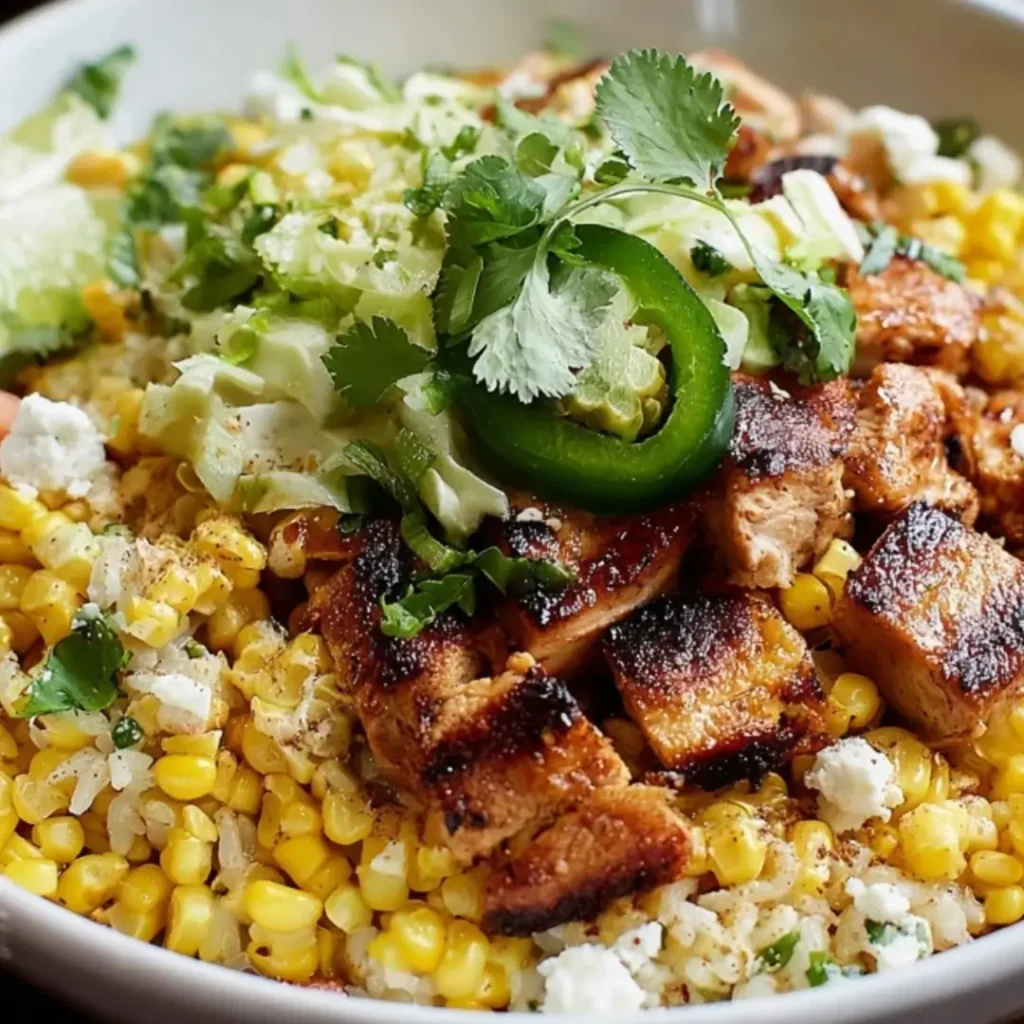 - Divide the cooked rice among 4 serving bowls. Top each with a generous portion of the cooked chicken and the prepared street corn mixture. Garnish with extra fresh cilantro, crumbled Cotija cheese, and a lime wedge. Serve immediately with hot sauce, if desired.