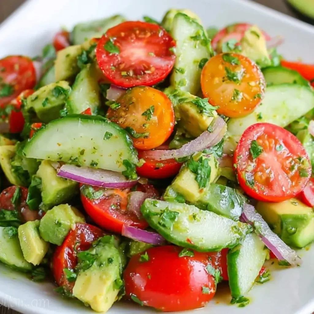 No, the dressing for this Fresh Tomato Cucumber Avocado Salad is not spicy. It’s a bright and zesty vinaigrette made with fresh lemon juice, olive oil, garlic, and dried oregano, offering a lovely tang that perfectly complements the fresh vegetables.