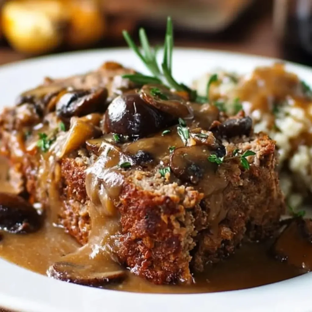 - Slice the rested meatloaf and serve warm with the mushroom and savory gravy. Garnish with fresh chopped parsley if desired.