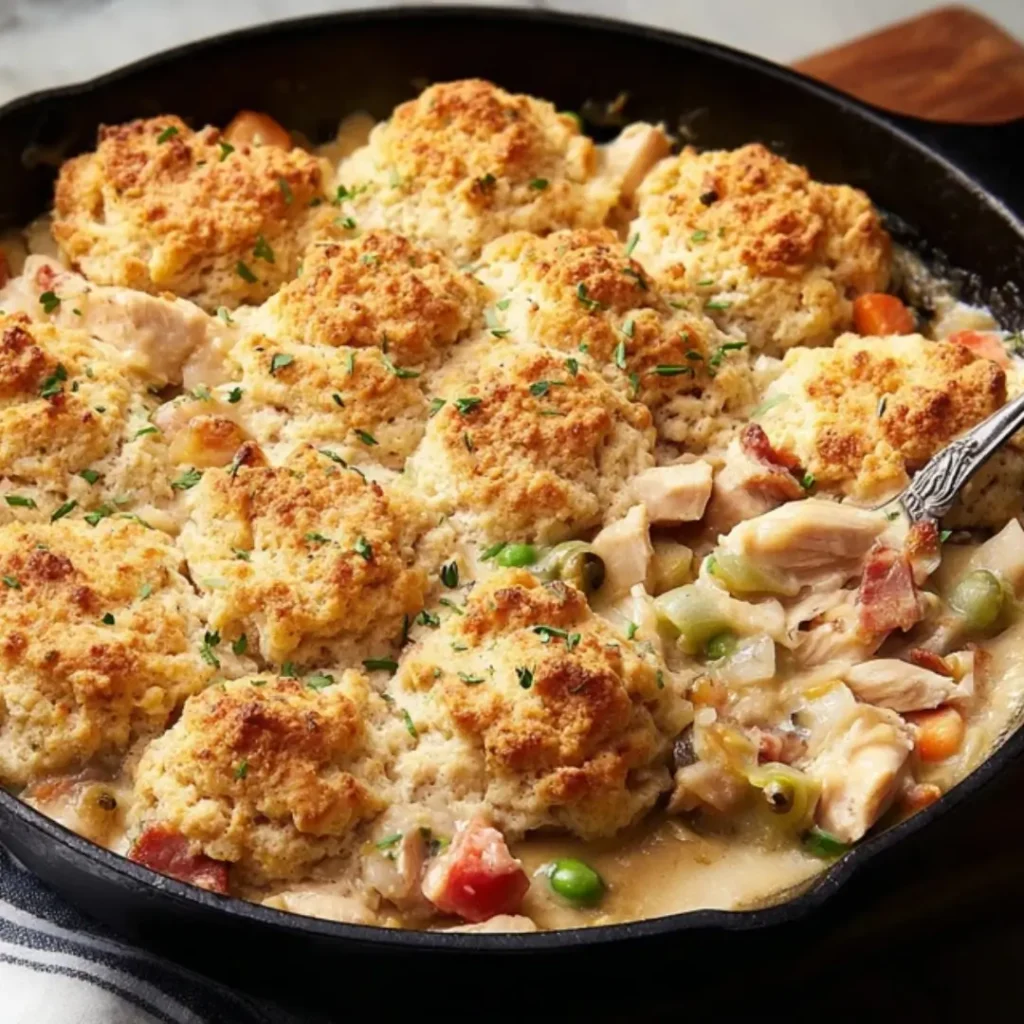 ![Creamy {{ $('Fetch Recipe Data').first().json["Main Keyword"] }} topped with golden drop biscuits in a skillet.](https://tastytablekitchen.com/wp-content/uploads/2026/03/one-pan-chicken-and-biscuits.webp)