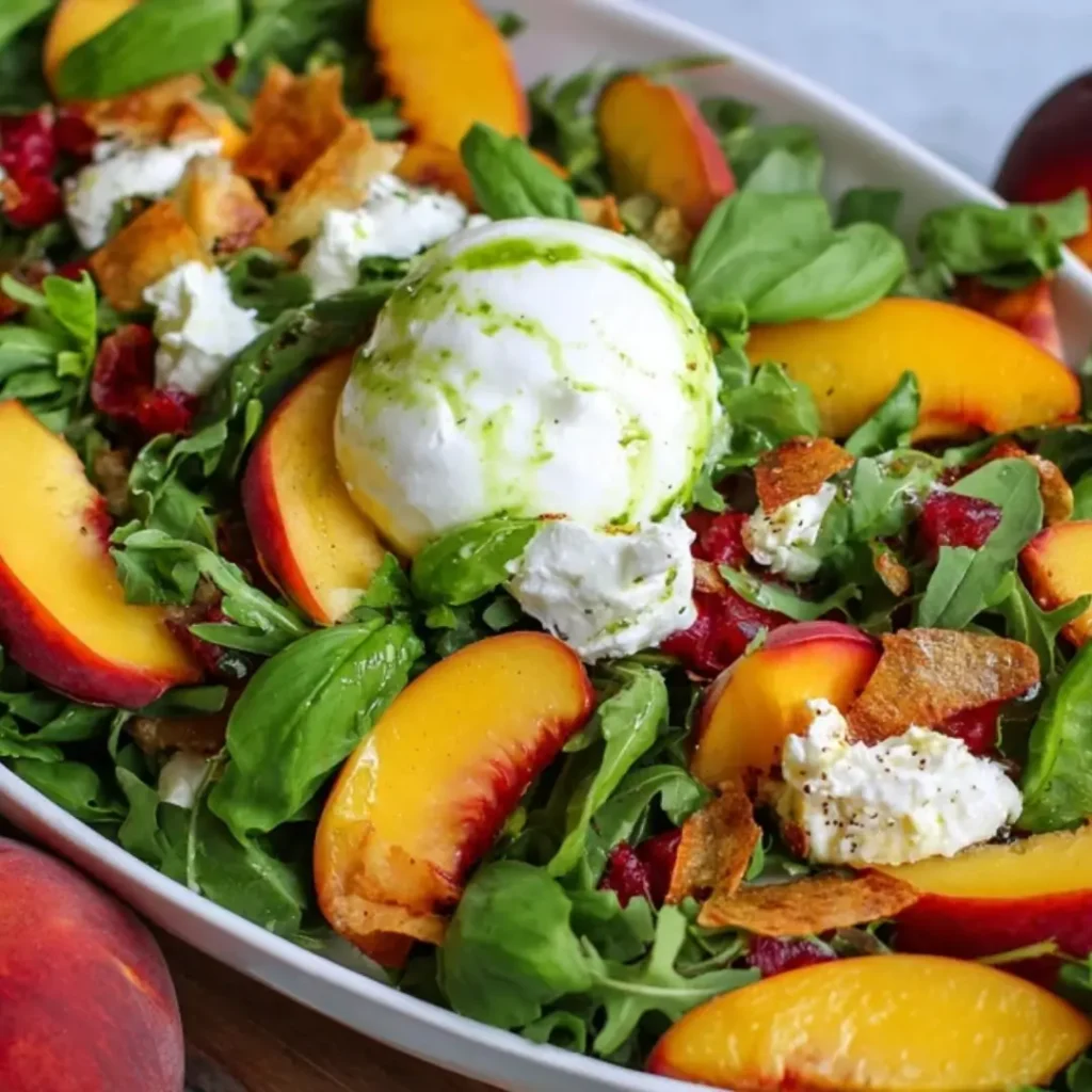 ![A platter featuring a {{ $('Fetch Recipe Data').first().json["Main Keyword"] }} with burrata and greens.](https://tastytablekitchen.com/wp-content/uploads/2026/03/peach-salad-recipe-with-burrata.webp)