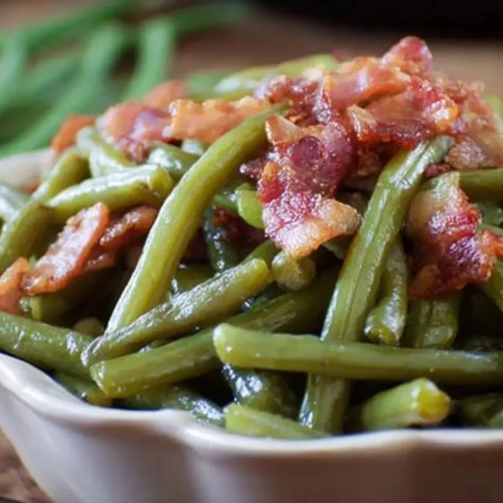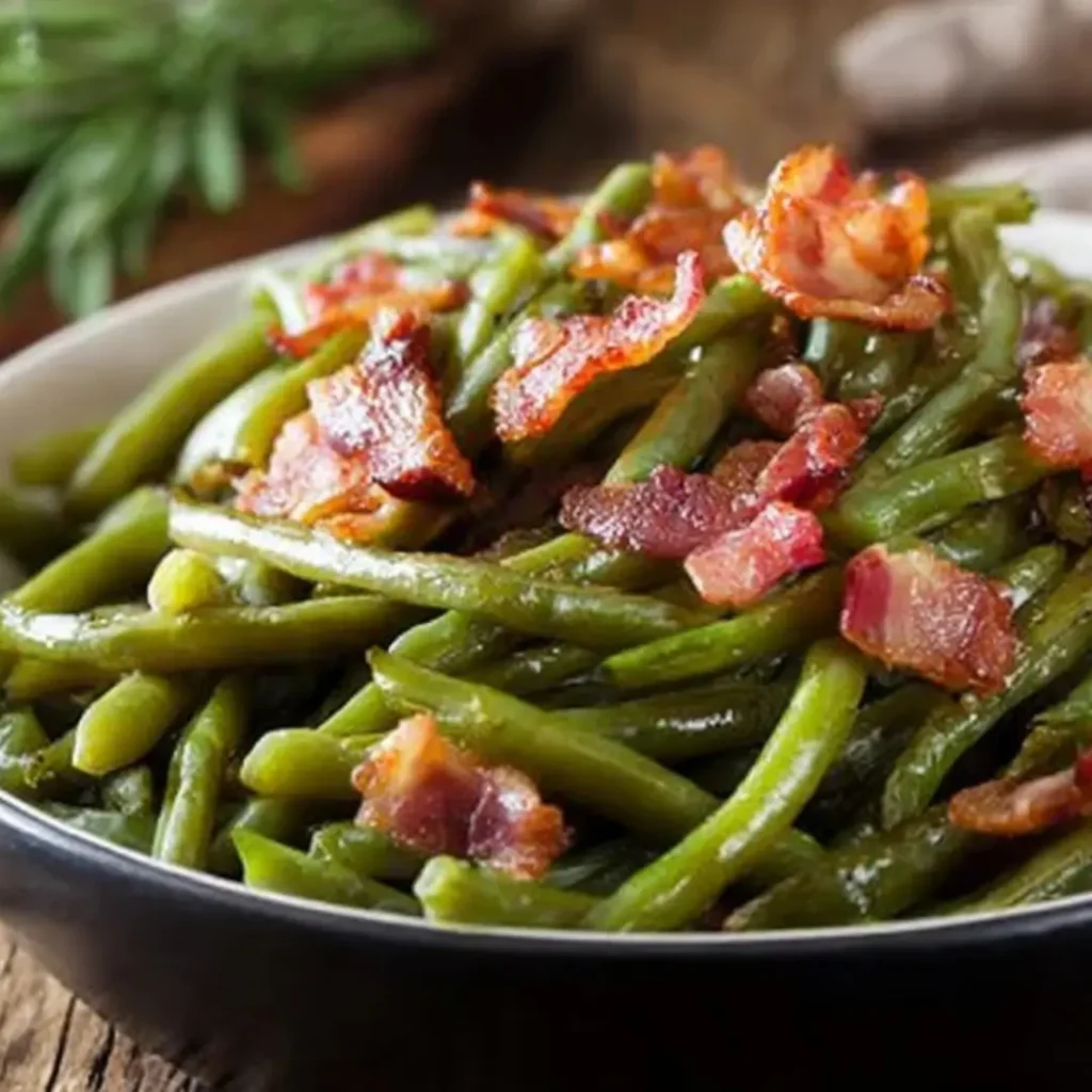 This comforting Southern Bacon and Green Beans recipe slow-simmers fresh green beans with smoky bacon, onions, and garlic in a savory broth, creating a beloved side dish that’s rich in flavor and tradition.